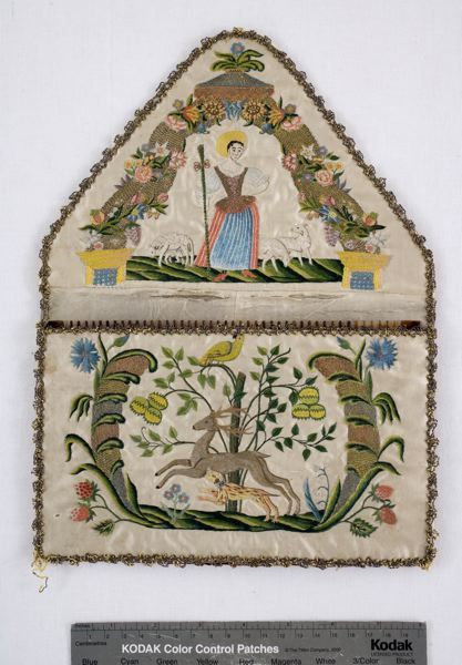 Väska av vitt siden, atlas, broderad i schattersöm, knutsöm, bottensöm