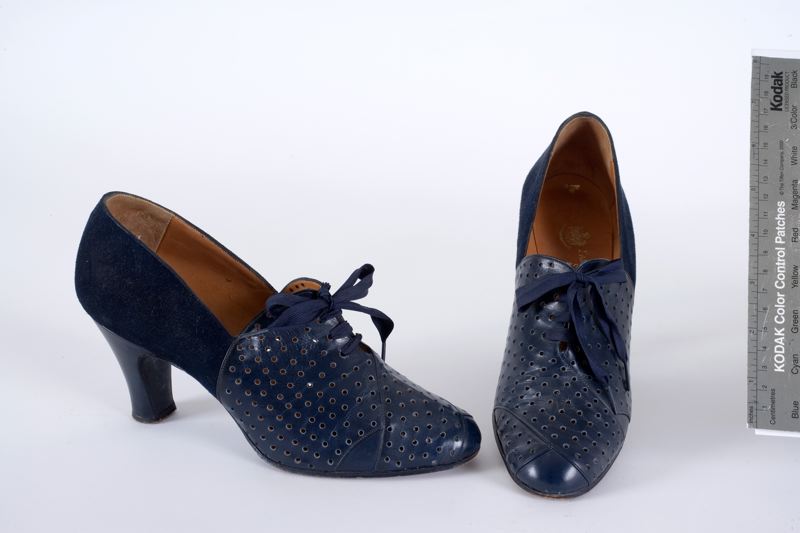 Skor av perforerat blått skinn med bakstycken av mörkblå mocka. Foder av