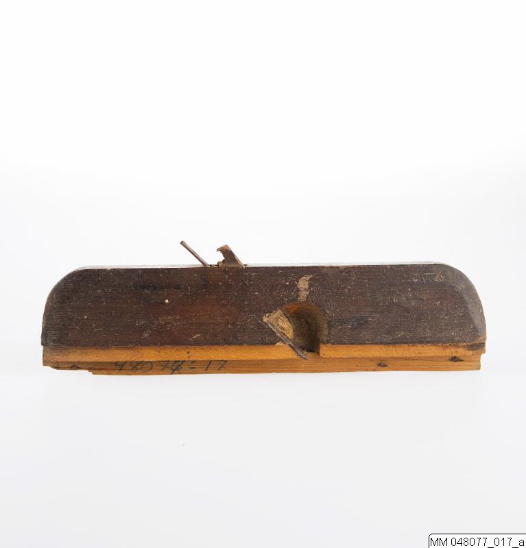 - Kälhyvel, tillverkad av trä med intakt hyveljärn. Träkilen som håller fast hyveljärnet är avbruten i båda ändar. Hyveln ser ut att ha blivit lagad vid något tillfälle. På ena sidan av hyveln finns bokstäverna "IIS".