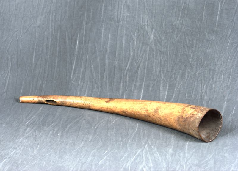Trumpet av elfenben, prydd med ett inristat huvud med horn.