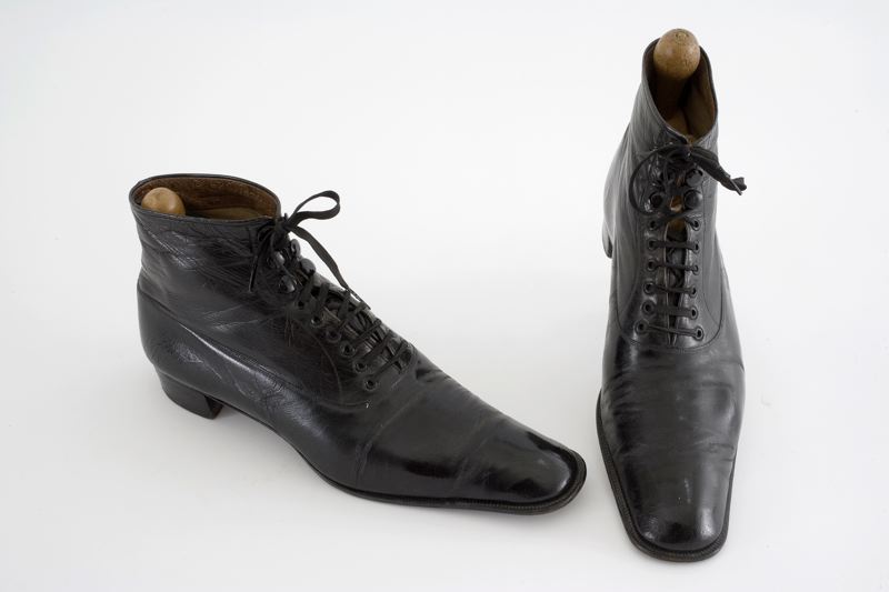 Ett par snörkängor, av lack- och chevreuläder, tillverkade av hovskomakaren Nils Jönsson "Malmös skickligaste yrkesman inom branschen" 1913, jämte block.