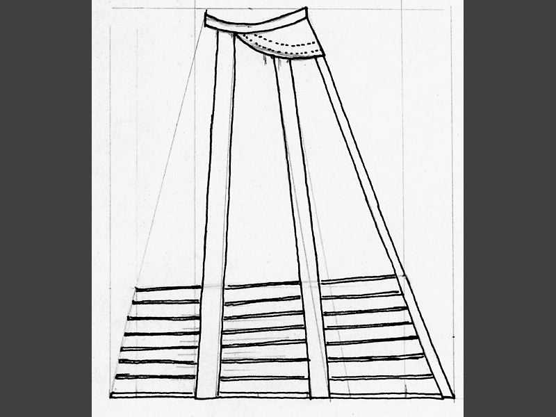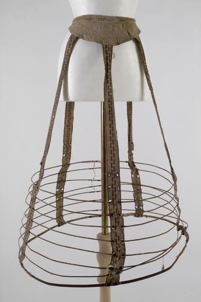 - Krinolin av fem gråbeiga bomullsband med invävt mönster av ullgarn i rött, grönt, ljusblått och violett. Nedtill håller banden åtta trådomspunna stålskenor på plats. Den nedersta är dubbelt så bred som de andra.