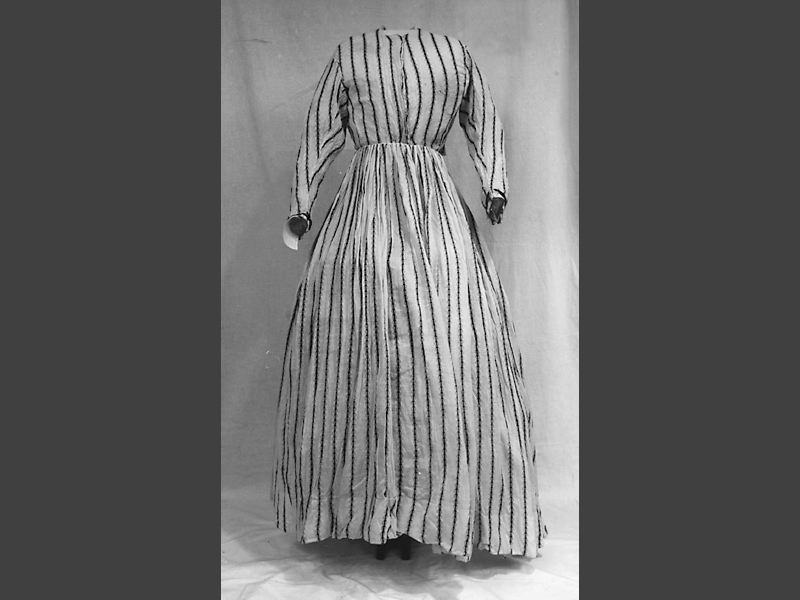 - Klänning av vitt tunt bomullstyg, s k moll, med tryckt mönster i svarta ränder. Liv med hög halsringning, rak midja och långa ärmar, ärmsluten dekorerade med två svarta band. Knäppning fram. Kjolens vidd rynkad och samlad i midjan.