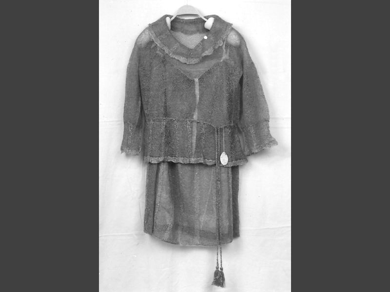 Klänning, bestående av jumper och kjol av glest stickat rött ullgarn och grått silke. Jumpern med lång ärm med manschett, rund halsringning med krage och i midjan en snodd/skärp med tofsar, skört i samma volang-utförande som manschetterna och kragen. Fastsydd underkjol av vit veckad tyll.