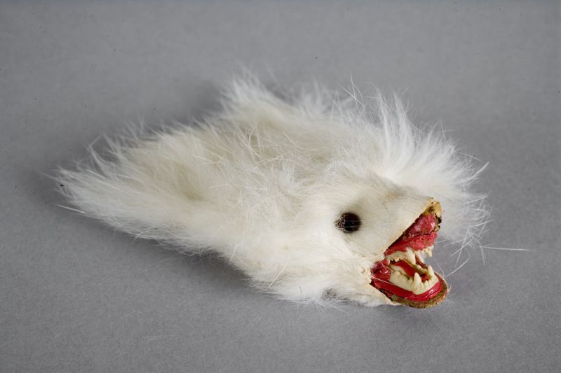 Djurhuvud gjutet av vit massa med skärt gap, svart nos. Överklätt med