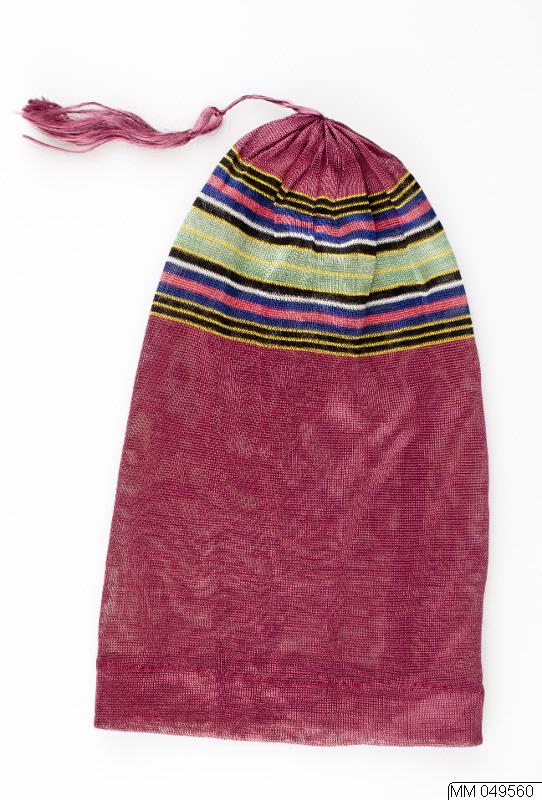 Mössa av röd silketrikå med ränder i gult,svart,blått,lackrött,vitt och