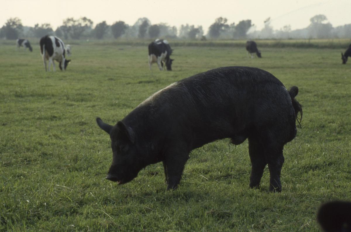 Utegångsdjur. Rammsjöstrand. Bjärehalvön, Skåne. 1986. Gris och kor.