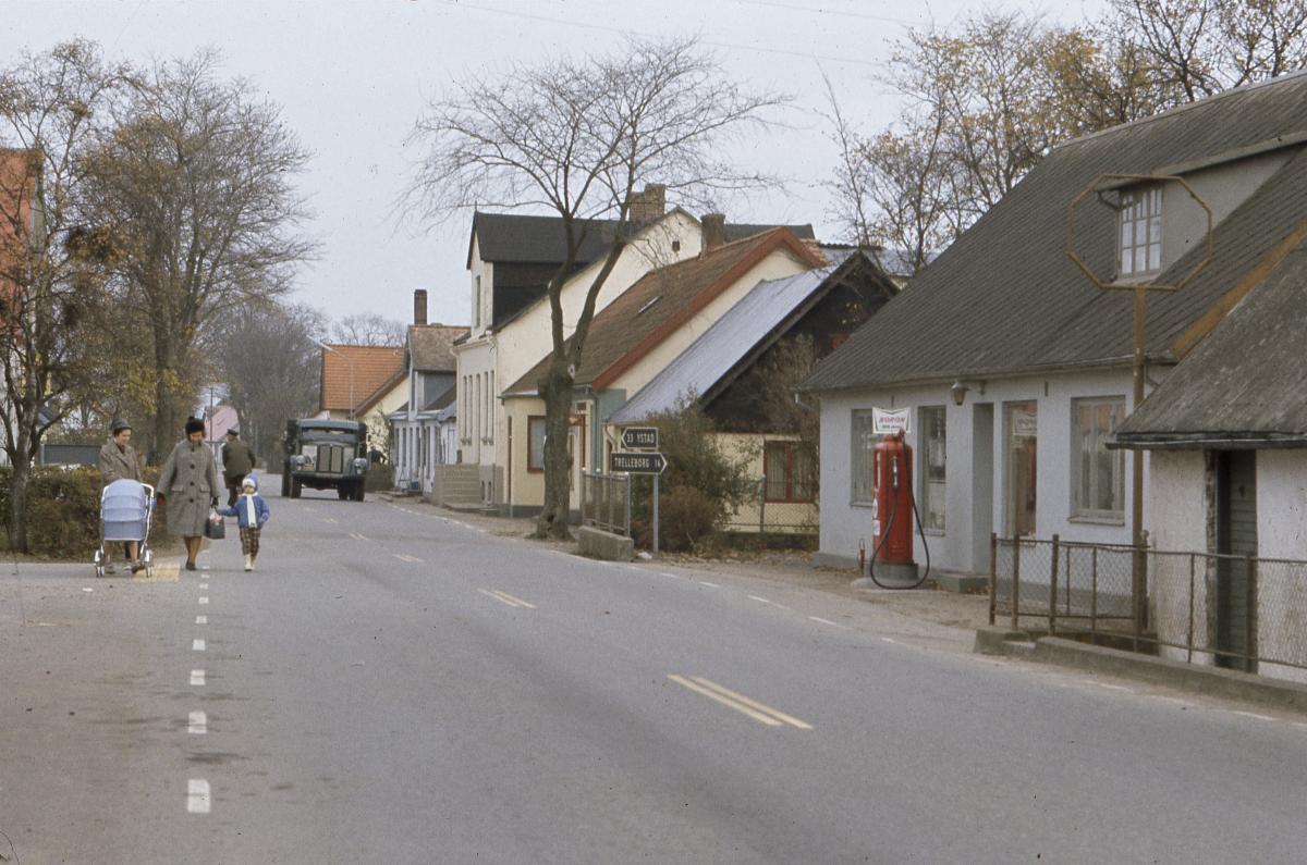 MM 062945:tema:422 :: bensinpump, gata, samhälle, väg, barn, promenerar, bensinstation, familj, mamma, promenad, barnvagn, by