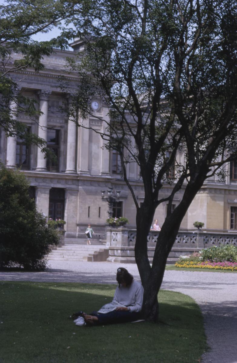 MM 062945:tema:672 :: kvinna, arkitektur, park, hus, byggnad, läsa, läser
