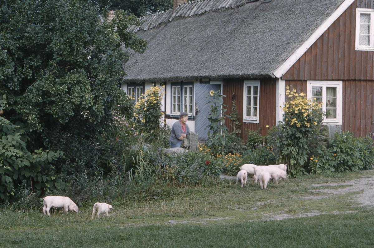 MM 062945:tema:802 :: korsvirkesgård, natur, halmtak, landet, grisar, griskultingar, trädgård, griskulting, hus, gris, gård