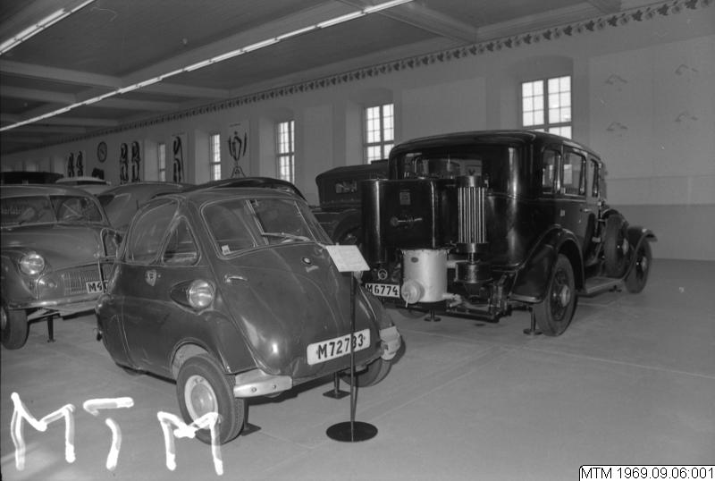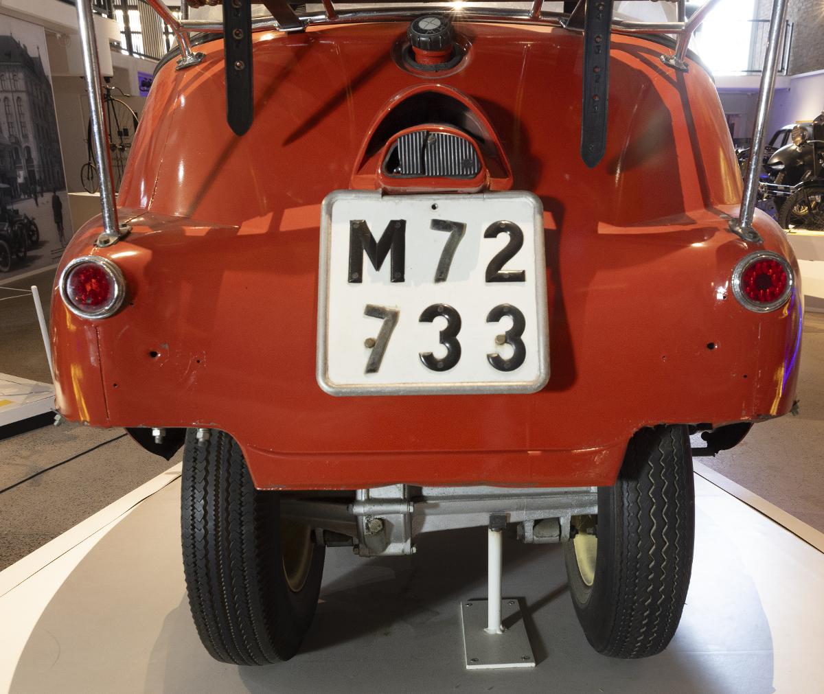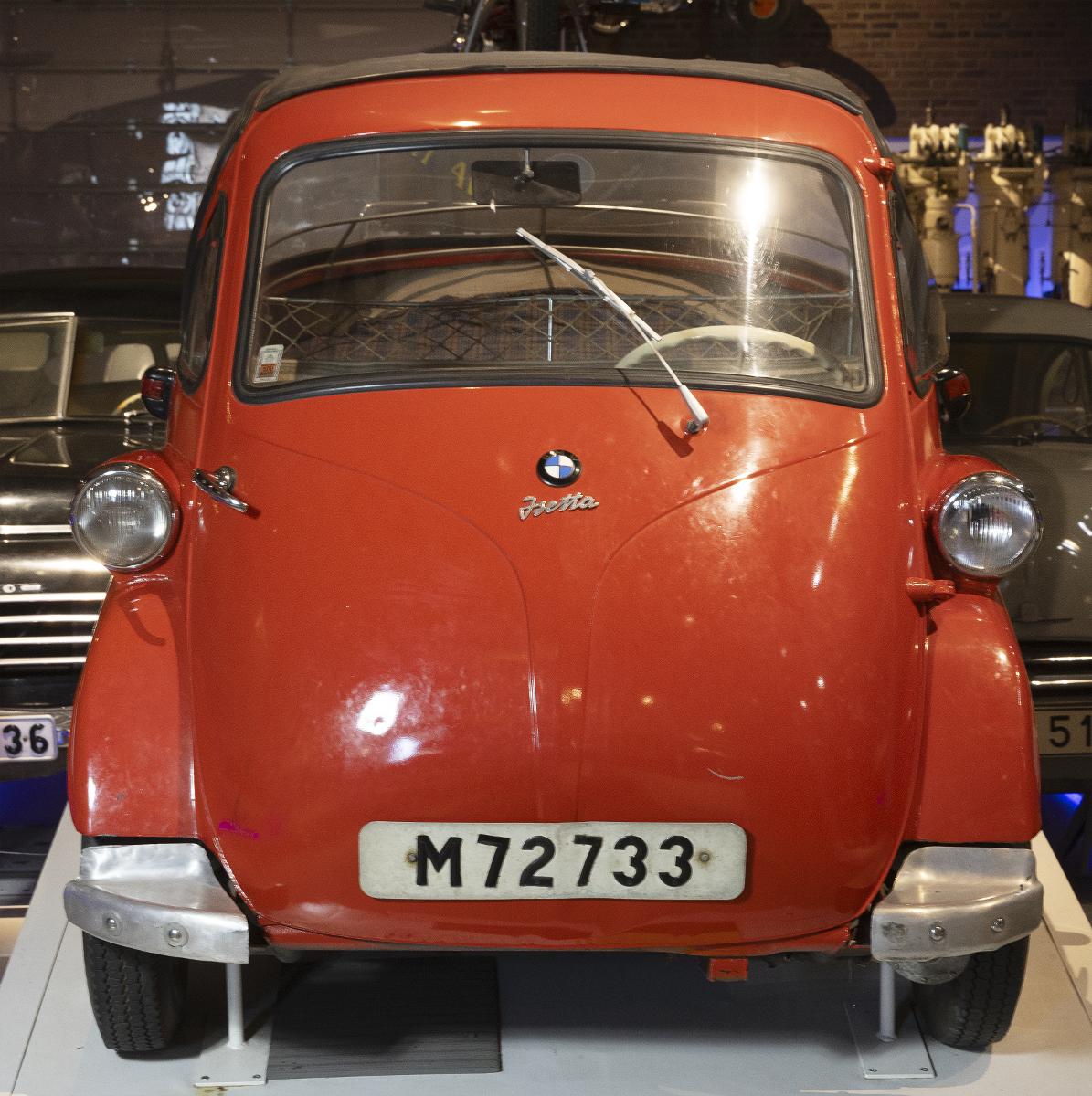 Personbil av märket BMW Isetta. Registreringsnummer M 72733. Inregistrerad på fru Strandh. Sista besiktning 1968. Chassienummer: 400872. 1-cylindrig BMW 4-takt luftkyld motor på 245 ccm. Effekt: 12 hk vid 5800 v/min. Växellåde: Tre växlar framåt. 2-sitsig. Maximihastighet: 85 km/tim. Vikt: 360 kg. Körd 49555 km. Instruktionsbok i källararkivet.