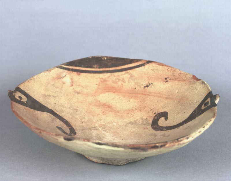 målad dekor på gulröd botten. Enligt givarens uppgift 2500-årigt