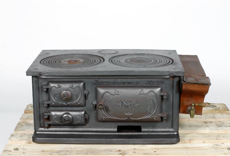 Spis på ben med två plattor. Box av koppar på höger sida. Märkt: Norrahammar No 29.