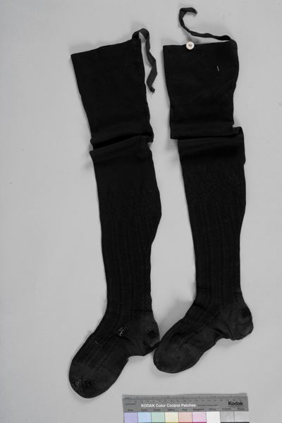 Ett par damstrumpor av svart bomull med genombrutet mönster runt vaden och fotens ovansida. Söm mitt bak. En tygknapp och ett isytt svart band i kragen på varje strumpa. Märkta: G W, med en svart etikett med vita bokstäver.