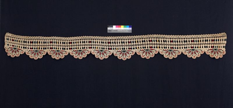 Lambrekäng virkad av tvinnat beiget bomullsgarn och broderad med