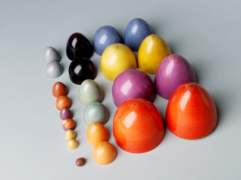 Leksaksägg av trä, svarvade fodral lackerade i olika färger 11 st