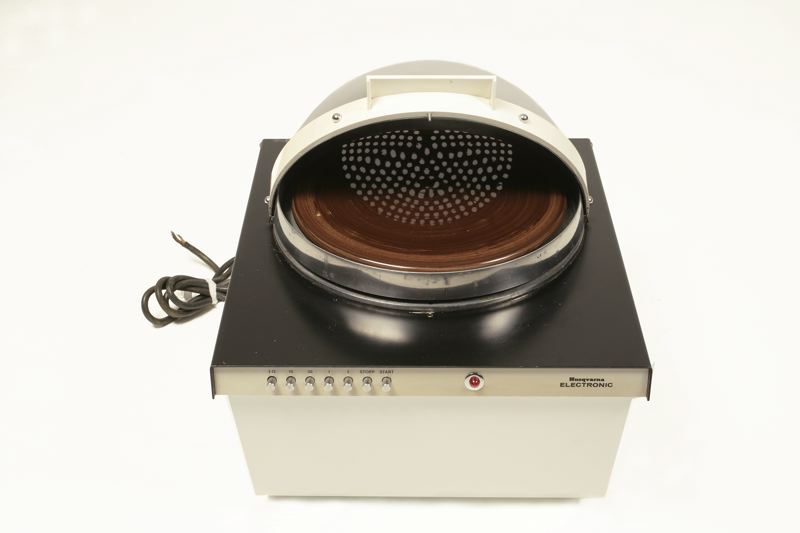 Mikrovågsugn som ritats av Malmös mest kände industridesigner Carl-Arne Breger. Föremålet är en designklassiker och började tilverkas för professionellt bruk 1961 och för konsumenter 1969. Föremålet är inköpt 1962 eller 1963 och har använts i hemmabruk. Inköpspriset var då 4000:-. Under kåpan ligger en brun/vit porslinstallrik märkt VDN P555 Rörstrand Sweden H-4. Stickkontakten till elsladden saknas. 1800 Watt. 220 Volt. AC 50 Hz. 2,0 kVA. 2450 MHz.