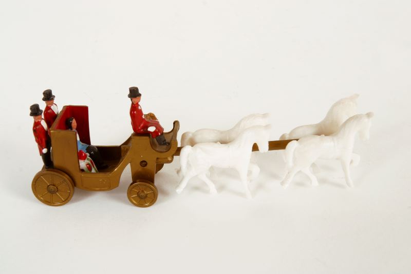 Miniatyrekipage draget av fyra vita hästar. Har varit utställd i Vagnmuseet till 2005.