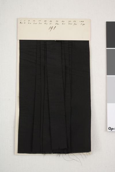 Bandprover, 2 st, med vävda sidenband med vardera fem band i svart taft.