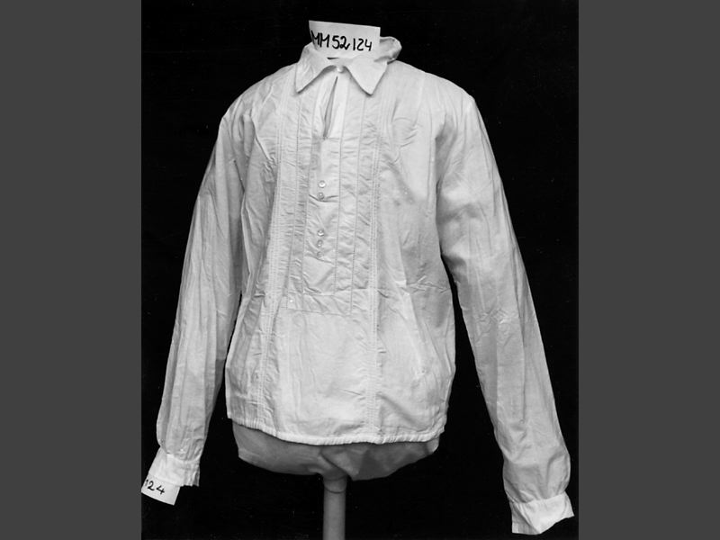 hålsömmar samt knappar. Lång ärm med manschett och liggande krage. Sprund vid kragen fram, knäpps med en knapp.
