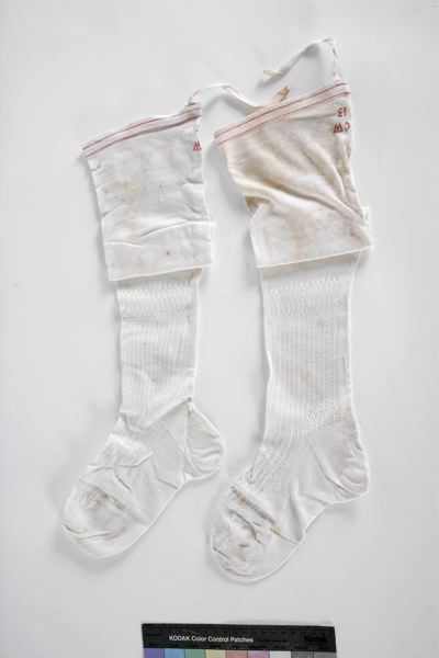 Ett par mönsterstickade strumpor av vitt bomullsgarn. Genombrutet mönster på vadens framsida och fotens ovansida. Fållen på skaftet har två rosa ränder och den ena strumpan har även en instickad märkning med en rosa linje under; L M. Broderad märkning med rosa korssöm: CW 13.