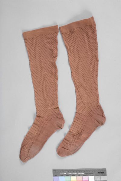 Ett par knästrumpor, dam, av rödbrunt bomullsgarn med fiskbensmönster. I kragen band av helgummi. Söm bak. Stoppade tår.