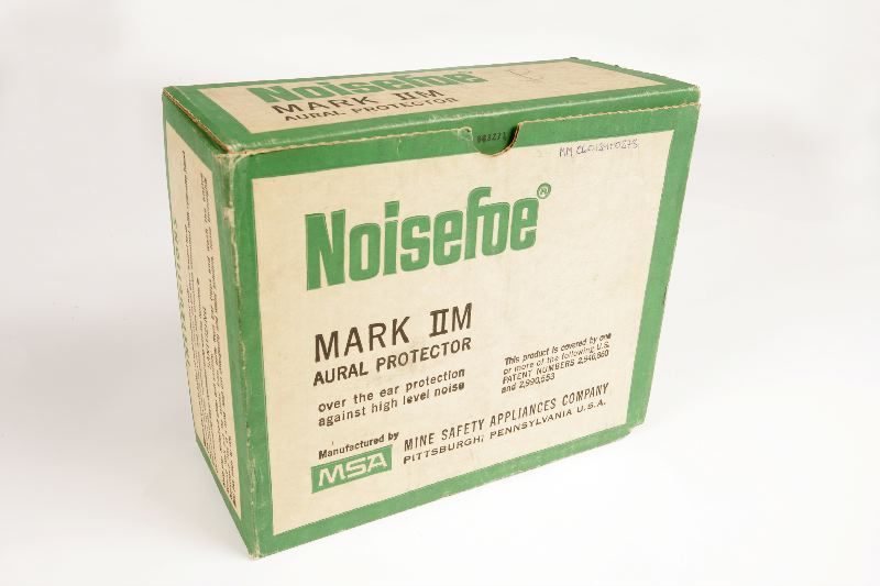 Ett par hörselskydd i originallåda märkt: Noisfoe Mark IIM Aural protector. Grå hörselkåpor.