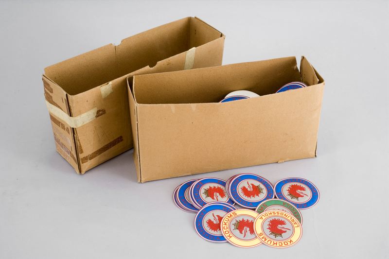 En papplåda innehållande runda märken. Följande typer med Kockums runda logo:
