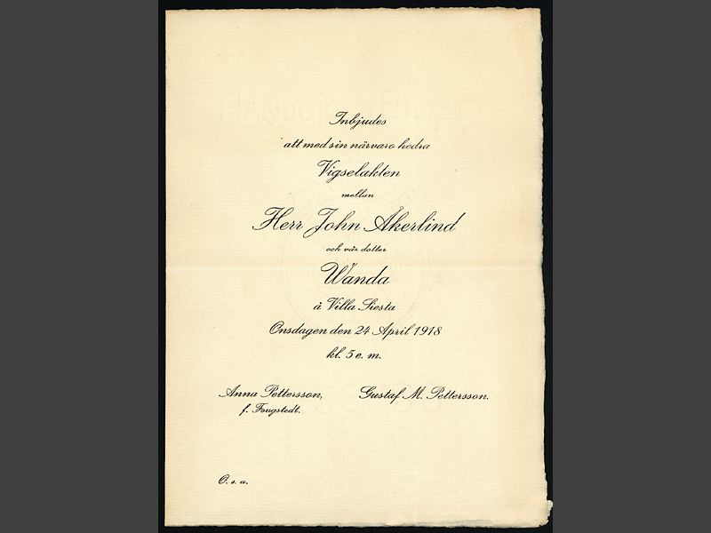 Inbjudan lyder: "Inbjudes / att med sin närvaro hedra / Vigselakten / mellan / Herr John Åkerlind /och vår dotter / Wanda / å Villa Siesta / Onsdagen den 24 April 1918 / kl. 5 e.m."