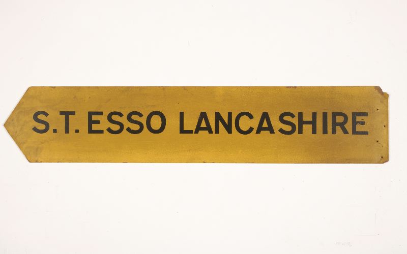 Två skyltar av masonit av olika längd med texten S. T. ESSO LANCASHIRE.