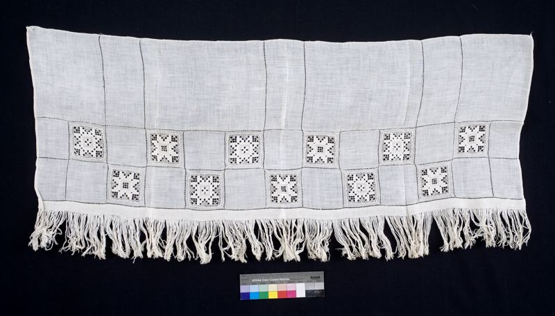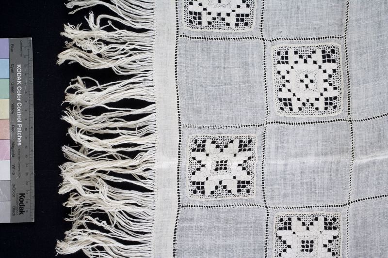 Gardinkappa av gles linne garnerad med stolphålsöm och infällda rutor i knutet och trätt arbete. Längs nederkanten påknuten frans.