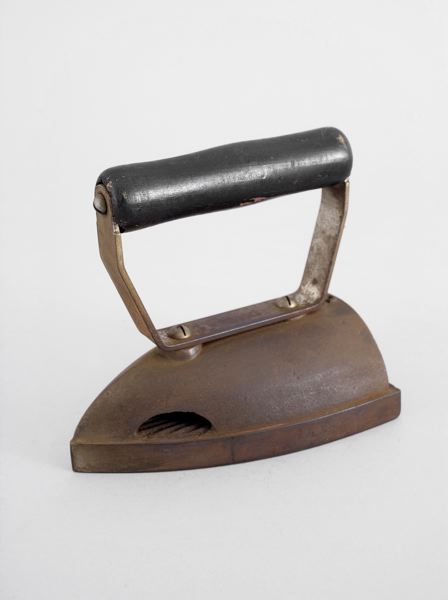 Strykjärn för gasuppvärmning. Svart trähandtag.