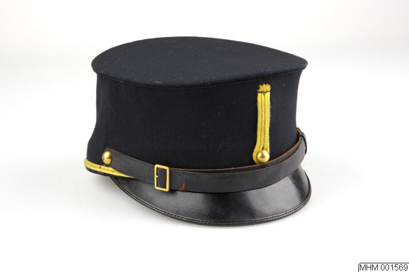 Uniformsmössa m/ä för manskap. Svart kläde med svart sidenfoder och svart svettrem. Med kulknappar och mössrem.