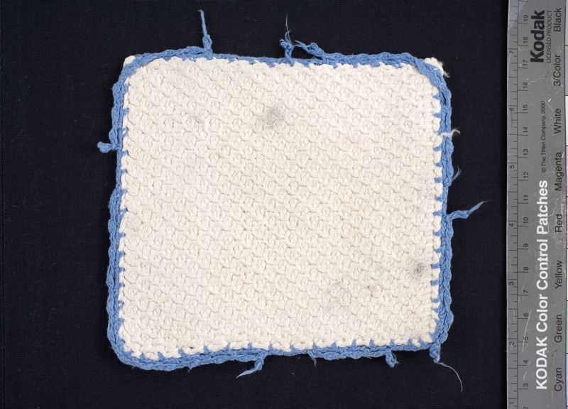 Grytlapp, virkad av vitt bomullsgarn med pikå i kanten av blått lingarn.