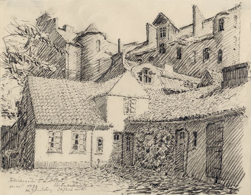 höger. Bakom ser man övre delen av högre stenhus i bakomliggande