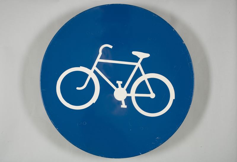 Vägmärke. Cykelbana. Ensidig. På baksidan märkt med Televerkets logo samt numret 62.