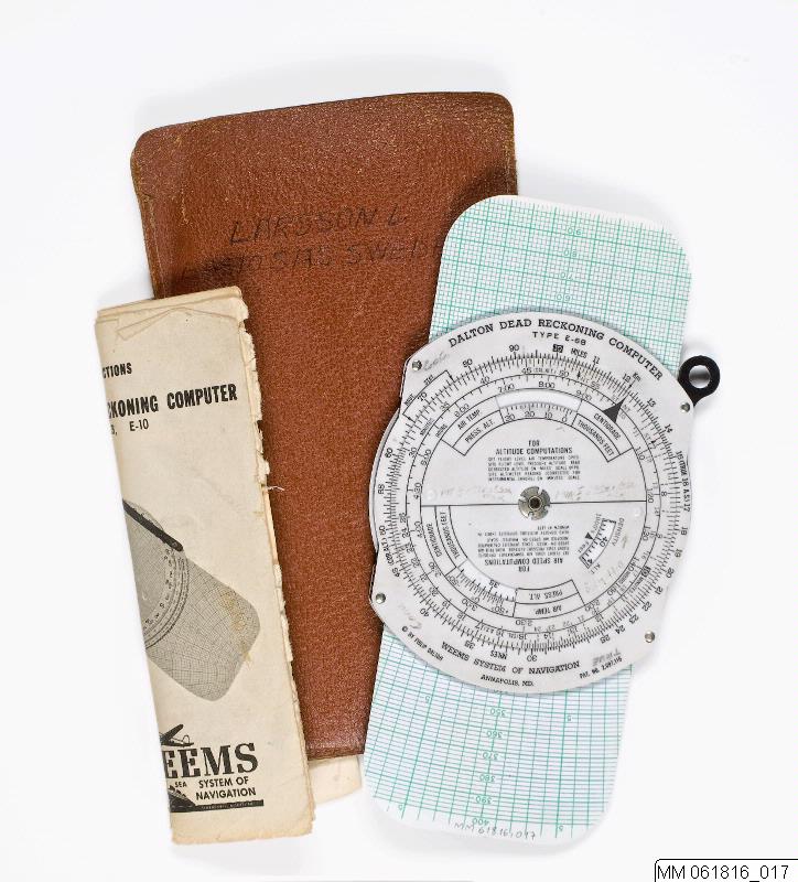 Navigationsskiva i brunt läderfodral. Dalton Reckoning Computer Type E-6B. Amerikansk bruksanvisning (skadad).