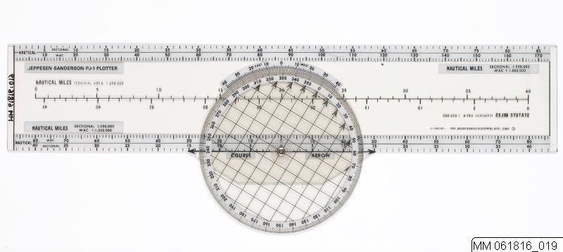 Naviagtionsskiva av transparent plast. Jeppesen Sanderson PJ-1 Plotter. Copyright 1965, 1976 Jeppesen Sanderson, Inc.