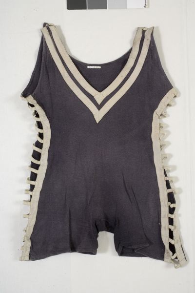 Mörkblå, ursprungligen svart (?) baddräkt i bomullstrikå med vita satinkanter. V-ringad fram, knäpps på axlarna. Korta ben. Fram och bakstyckena är i sidorna sammanlänkade endast med smala vita satinhällor, 16 st per sida.