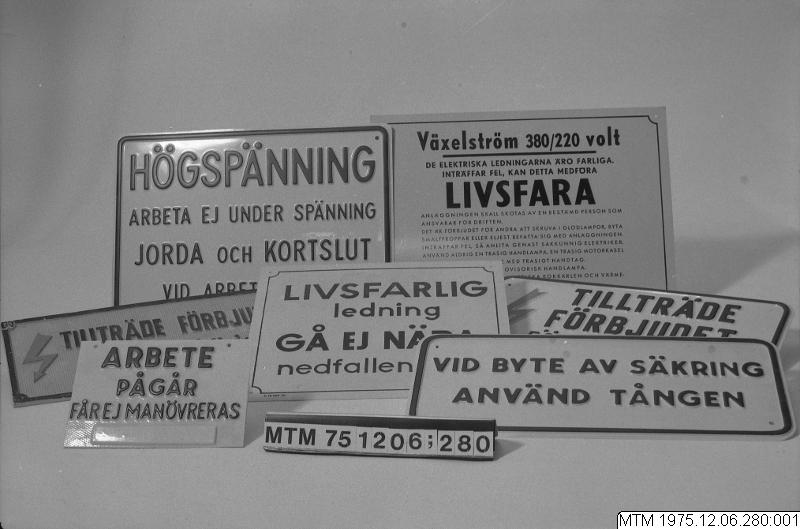Gul varningsskylt av tunn plåt. Text: Växelström 380/220 volt. De elektriska ledningarna äro farliga. Inträffar fel, kan detta medföra LIVSFARA. Anläggningen skall skötas av en bestämd person som ansvarar för driften.
