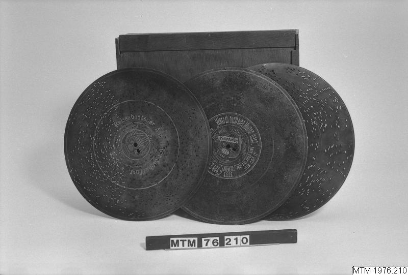 Musikskivor för s k Polyphonspelare, speldosetyp. 1800-talsmusik. Fabrikat: Symphonion, made in Germany, tyskt patent. Förvarade i trälåda med skjutlock.