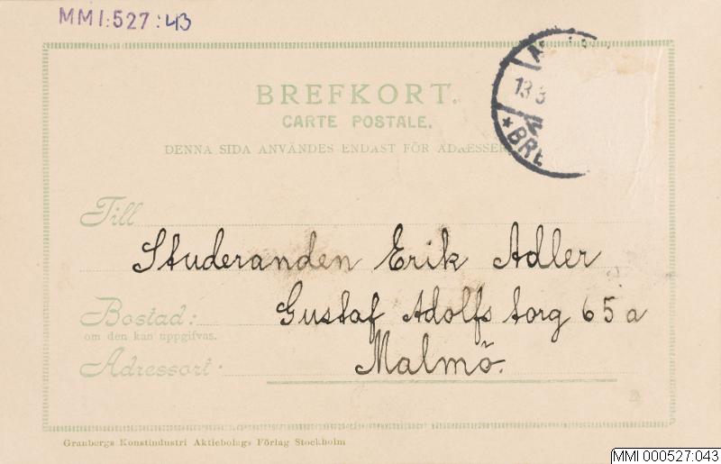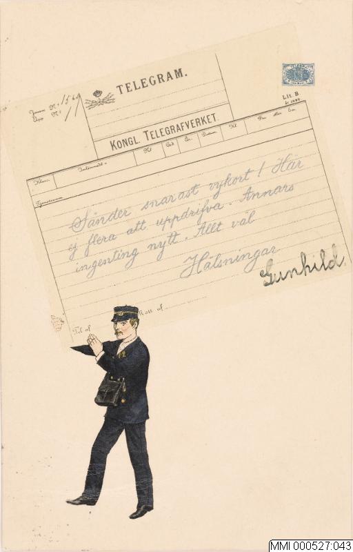 - Brevkort av papp och färgtryck med motiv av en brevbärare bärandes på ett överdimensionerat telegram. Tryckt text: TELEGRAM. / KONGL.TELEGRAFVERKET. Samt längre ned, förtryckt: Sänder snarast vykort! Här / ej flera att uppdrifva. Annars / ingenting nytt. Allt väl / Hälsningar Och handskrivet därefter: Gunhild. På baksidan tryckt: BREFKORT. / CARTE POSTALE. Samt handskriven adress, frimärke samt halva stämpeln avrivna.