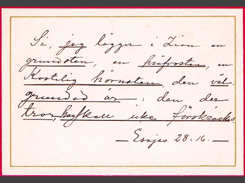 Brevkort av papp och färgtryck med handskrivet bibelspråk: "Si, jag lägger i Zion en/grundsten, en kräfvosten,en/Kostlig hörnsten, den väl/ grundad är:den der/tror, han skall icke förskräckas./Es. 28:16."