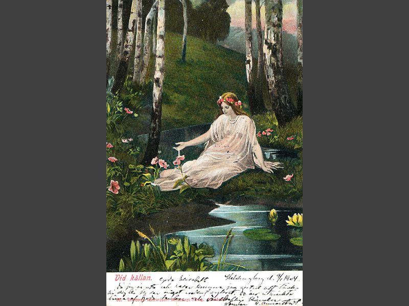 Brevkort av papp och färgtryck föreställande en ung kvinna klädd i vitt,