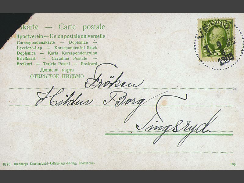 På baksidan "vykort" tryckt på olika språk samt handskriven adr. Svenskt