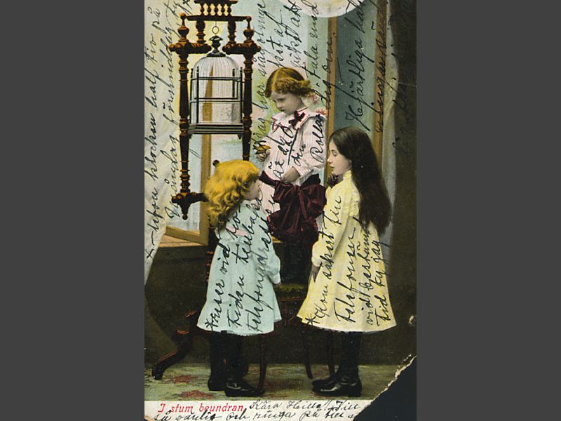tittar på en kanariefågel. Under bilden tryckt "I stum beundran" samt