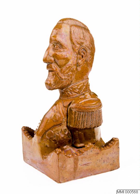 Pipställ av rödbrunt lergods med gulbrun glasyr. Gjutet och skulpterat i form av fristående porträttrelief av Oscar II i profil åt vänster.
