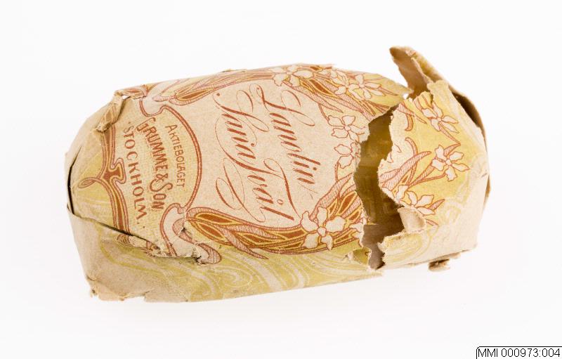 Lanolin tvål, gul tvål i brunt omslagspapper med liljor. Brun text: