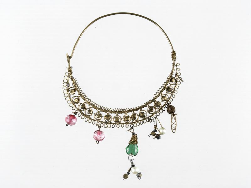 underkanten hänger två rosa och en grön glaspärla, samt ett par