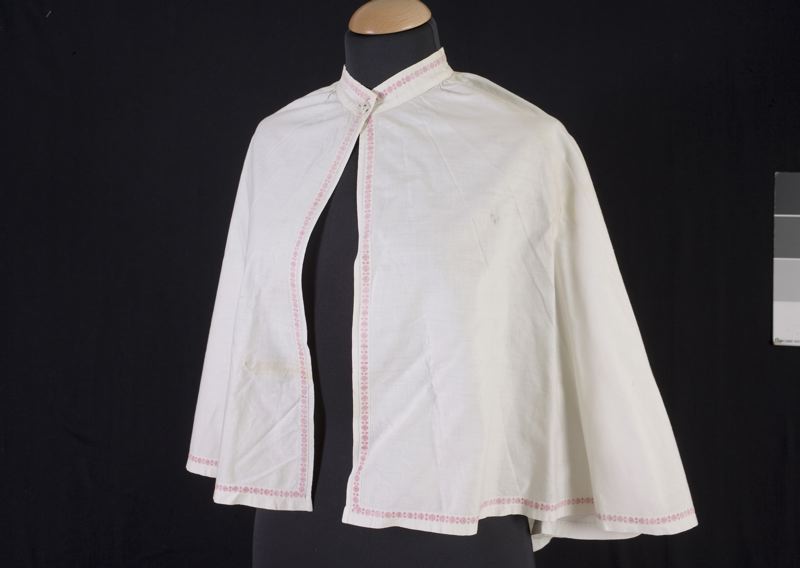 Kamkrage av vitt bomullstyg, garnerad med mönstervävda skära